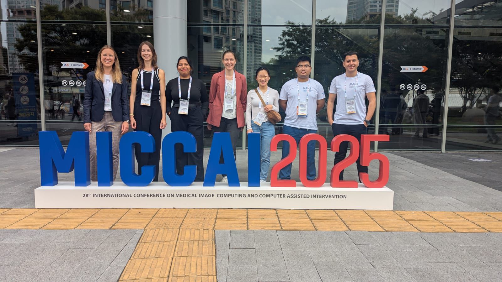 At this year’s International Conference on Medical Image Computing and Computer Assisted Intervention (MICCAI 2025), our PR@CAIDAS/AIMI@FAU researchers shared exciting new advances in medical imaging and AI: Maja Schlereth presented her latest work on self-supervised super-resolution, enabling the generation of high-resolution MR images with detailed anatomical structures using only two orthogonal anisotropic low-resolution scans. Jingna Qiu showcased her research on annotation-free vision–language model adaptation at the COMPAYL workshop. Sweta Banerjee also presented at the COMPAYL workshop her recent work, which uses a triple-condition setup (context patch, inpainting mask, and chromosome mask) to generate realistic mitosis images by mixing morphology and tissue backgrounds and improve atypical-vs-normal classification with this synthetic data. Xingjian presented at Agentic AI in Medicine workshop a LLM-based agent framework to assist with the interpretation and execution of CT scan protocol configuration requests given in natural language or a structured and device-independent format, aiming to improve the workflow efficiency and reduce CT technologists’ workload. Karim Elbarbary presented at the DeepBreath workshop a clinically inspired multi-view vision-language model for enhanced mammography mass detection. It was truly inspiring to connect with researchers from around the world and exchange ideas that drive innovation in medical imaging. To explore more of our research, check out our papers or reach out to us directly. A big thank you to the MICCAI 2025 organizers for an outstanding event!