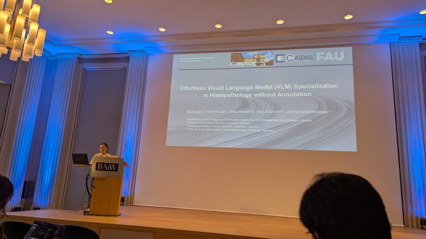 Four PhD researchers from our team also contributed actively: Jonas, Maja, and Anne presented their projects during the poster sessions, while Jingna delivered a talk titled “Effortless VLM Specialization in Histopathology without Annotation”. The conference offered an excellent opportunity to connect with familiar faces and exchange ideas within the Bavarian AI-med community.